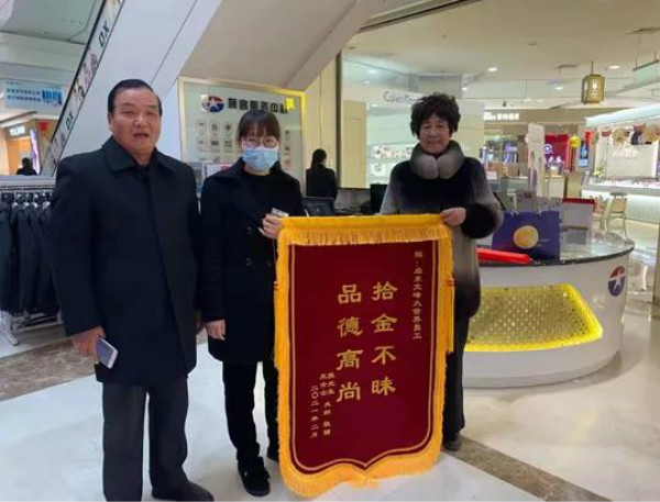 當(dāng)這位女士聽說(shuō)顧牡丹一直在尋找她的時(shí)候,感動(dòng)地表示,到底是文峰人啊,撿到兩萬(wàn)多塊錢的金器,不但不貪圖,還主動(dòng)地找我。回去后,她和家人特地制作了一面錦旗送到柜臺(tái),以表達(dá)對(duì)文峰員工的感謝之情。