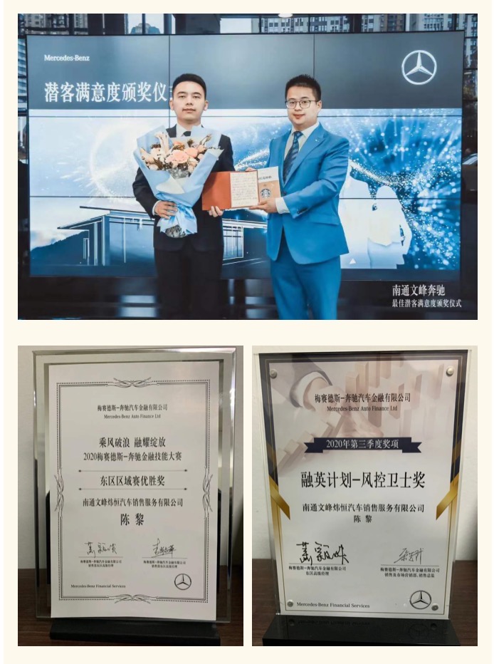 ▲ 南通文峰奔馳銷售部在“梅賽德斯-奔馳全國潛客滿意度”評(píng)選中取得優(yōu)異成績,金融部在梅賽德斯-奔馳東區(qū)金融技能大賽斬獲“東區(qū)區(qū)域賽優(yōu)勝獎(jiǎng)”和“融英計(jì)劃-風(fēng)控衛(wèi)士獎(jiǎng)”