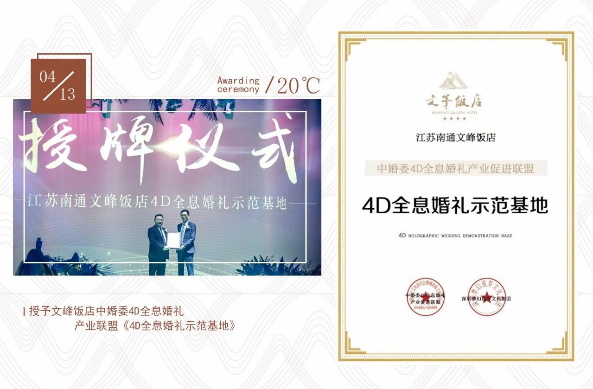 2019年4月,文峰飯店舉辦了《2019春季4D全息婚SHOW星光文化展》,南通市原副市長(zhǎng)、旅游協(xié)會(huì)會(huì)長(zhǎng)朱晉;南通市委宣傳部文化改革發(fā)展處處長(zhǎng)顧凡;南通市商務(wù)局副局長(zhǎng)楊丁勇等領(lǐng)導(dǎo)出席了活動(dòng),中婚委4D全息婚禮產(chǎn)業(yè)聯(lián)盟授予文峰飯店《4D全息婚禮示范基地》。