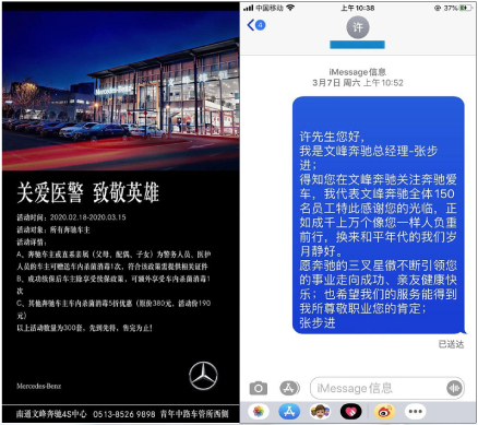 疫情并沒有阻隔我們向英雄致敬,在全國疫情緊張的情況下,南通當?shù)蒯t(yī)療救援隊也支援了武漢。為致敬英雄,南通文峰奔馳店對所有醫(yī)護人員、警務人員車主提供了免費車內殺菌消毒服務,奔馳店負責人還向英雄們發(fā)送了致敬關愛短信。